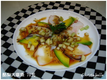 店裡的服務生都好年輕喔!不過手腳很快,態度也不錯。不一會兒就幫我們上了開胃菜。這開胃菜蠻大一盤的,盤子跟店裡的風格一樣,有著F1賽車旗子一樣的黑白方格。盤中章魚跟酪梨大約各5、6片,還有一些蘋果丁、香草植物,搭配油醋醬。視覺上效果不錯。不過吃起來就還好而已,首先我覺得章魚沒有那種新鮮的Q度,有點硬了。酪梨片薄薄的,不過味道還好。