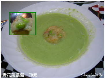 再來就是湯了。我的青花菜濃湯算是這次消費裡我比較滿意的。我想這湯可能是將綠色花椰菜以果汁機打成泥狀,加到奶油濃湯裡。整個湯呈現美麗的草綠色。中間還有一球馬鈴薯泥。味道嚐起來還不錯,而且心裡面就覺得是到很健康的湯品。馬鈴薯泥口感也蠻密實的,裡頭還有毛豆呢!