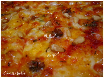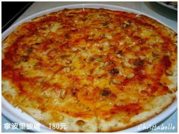 我們喝完湯,開胃菜也吃的差不多的時候,主菜跟著上來了。上菜時間掌握還不錯。我的拿波里披薩,是披薩裡頭最貴的,強調的是雙份cheese(馬芝拉起司、披薩起司),另外還加上馬鈴薯泥,松子及些許鯷魚。別看這披薩很大一塊,因為古拉爵的披薩是薄皮的,所以份量不至於太多。所謂的薄皮,是真的很薄喔!比蘇打餅乾還要薄。我吃了一口...覺得這披薩有點遜掉了!因為吃起來居然有粉粉的感覺!味道還OK,但就是那種粉粉的感覺,一直持續到最後一口為止。我在想是不是做披薩的麵粉不好,而且上面的餡料不夠紮實、太少了,才會有這樣的口感。