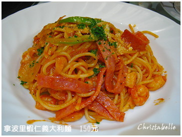 同學的拿波里蝦仁義大利麵,我吃了一小口,覺得味道就是大眾口味的茄汁蝦仁義大利麵。也普普。裡頭有蕃茄、炒蔬菜(那天是花椰菜)、火腿等。