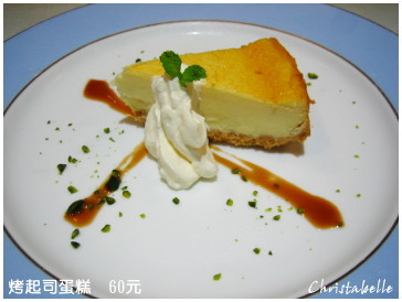 最後上來的甜點「烤起司蛋糕」。份量作為餐後甜點是恰如其份,加上巧克力醬、鮮奶油及薄荷葉等盤飾,看起來還不錯。最近我甜點的味蕾神經還蠻發達的,所以迫不及待地吃了第一口。天啊!大失敗!那起司蛋糕空有起司蛋糕的口感,卻沒有起司的味道!反而是那種冰在冰箱裡的、走味了的味道!真的很後悔沒有點飲料,至少飲料還不至於會失敗到哪去。