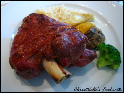 這豬腳真的令人印象深刻!份量對女生來說算是不小,皮炸的很酥脆,但令人驚訝的是完全看不出絲毫的油膩。另外搭配簡單的德國酸菜、馬鈴薯千層派、甜椒、炸香菇以及一小朵花椰菜。