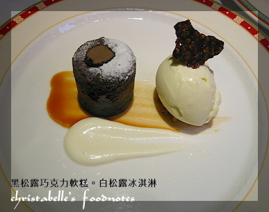 首先「黑松露巧克力軟糕與白松露冰淇淋」,一黑一白像似唱雙簧一般,樸實的外表下,因為它們名字的關係,藏有黑洞般的巨大引力。所謂的巧克力軟糕,其實就是chocolate fondant,也就是同事跟我某天在星巴克吃到的80元,切開就會有巧克力漿流出來的巧克力點心。chocolate fondant本身就以夠讓人神往,更何況被冠上黑松露的詞頭?