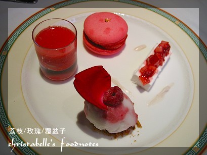 另外這一盤裡頭有四種小點。託這盤點心的福(還有becco),我才知道季節師傅這一盤其實是效法法國甜點大師 Pierre Herme 的三種食材的夢幻組合:「荔枝」、「覆盆子」與「玫瑰」,而有的創意之作。真是增廣見聞。荔枝有時太甜,覆盆子有時過酸,兩者中間以玫瑰溫和的味道緩衝,這種組合果真夢幻。