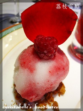先說說雪酪。這一球雪酪紅白相間,自然是因為荔枝與覆盆子的關係。雪酪頂端還有一顆完整的覆盆莓以及鮮紅色的玫瑰花瓣。這雪酪嚐起來帶著荔枝那種獨特卻又熟悉的甜,偶爾有覆盆子的酸。跟方才的松露冰淇淋相比,一個是濃妝的都會女子,一個則是素顏的少女,各有特色。