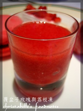 另外有一杯紅豔欲滴的則是覆盆子與玫瑰打成的果汁(似乎只能這麼稱呼)。蠻濃稠的,喝起來以覆盆子的味道比較突出,不過也有玫瑰的香氣。記得要用湯匙挖寶喔!因為裡面還有荔枝果凍!