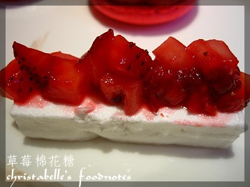 咦?棉花糖上怎麼成了草莓?季節師傅說他沒辦法進口到新鮮的覆盆子,只好改用美國草莓。選美國草莓也是有原因的,首先因為台灣的草莓季過了,加上美國的草莓比較酸,接近覆盆莓的口味。另外不如台灣草莓那樣多汁,也是他選擇美國草莓的原因。這棉花糖其實吃起來就普通,我沒什麼過於驚嘆的評論。