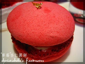 最後壓軸的就是法國甜點大師 Pierre Herme的代表作:Emotion Ispahan。我去查了一下,Ispahan原來是古代波斯的一個大城市,位於現代伊朗中部。另外,Ispahan也是大馬士革玫瑰的一種('Rose d'Isfahan'),開花期很長,而且香氣濃郁。Pierre Herme在巴黎以及東京的點心小店裡,最受歡迎的當屬這種 "Emotion Ispahan"杏仁小圓餅(macaroon)了。PH的正統小圓餅外表因為加了玫瑰水而帶著淡紅色,不過季節師傅的顏色比較深,可能還加了草莓或是覆盆子汁也不一定。裡頭原本應該夾的是覆盆莓及荔枝,但季節師傅,受限於無法使用覆盆莓,而用草莓代替。另外還夾有一些加了玫瑰花瓣的奶醬。PH的正統版本,應有一片玫瑰花瓣以及一顆覆盆子放在小圓餅上頭,但季節師傅以食用金箔代替。