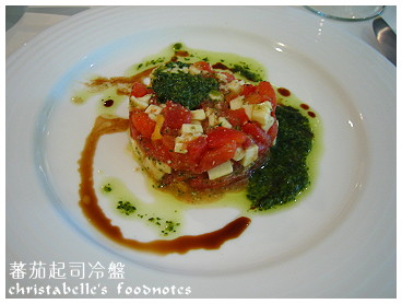 蕃茄起司冷盤以及鮭魚花椰菜塔在我們喝完湯後不久就上菜。先說蕃茄起司冷盤,其實跟義大利的insalata caprese的內容很像,都是新鮮蕃茄與mozzarella起司的組合。不過Saveurs是把它們切成小丁,疊成一圓塔形,加上自制製的青醬。這冷盤的清爽不在話下,而青醬的香氣也適度地提供味覺上的變化,吃起來比較不那麼單調, 同時也刺激食慾。