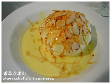 要到飯後甜點決一勝負的關鍵了。服務生沒有問我們要來點什麼甜點,讓我們挺期待的。答案揭曉,服務生分配給我的是「香草浮冰山」。這道甜點becco在先前的PTT美食板文章中及提到,是主廚自前一任東家法國鄉舍餐廳帶出來的甜點。這道用只用蛋白去打發烘焙成一圓球狀的乳白點心,飄浮在嫩黃色的creme anglais(香草奶醬)中,淋上一些焦糖漿,灑上杏仁片,整體的色調是屬於春夏的。不過由於是用蛋白製作,所以吃起來有些蛋白天然的腥就是了,所以跟creme anglais一起享用比較好些。
