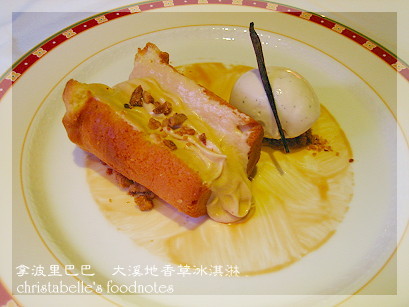 第二道是「拿波里巴巴與大溪地香草冰淇淋」。嗚...居然也是大溪地香草冰淇淋~~不過這冰淇淋上頭還多了一根直挺挺的黑色小枝。我還以為是巧克力,而同事眼尖,發現這是香草荳莢呢!我聞了一下已經沒有什麼味道了。