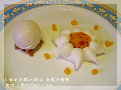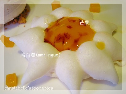 第一道是「夏季太陽花與大溪地香草冰淇淋」。「夏季太陽花」...看中文可能對於這道甜點毫無頭緒,不過英文裡寫明了是 "meringue" (但menu上拼錯了^^)。meringue一般稱為 "蛋白糖霜",因為主原料就是打發的蛋白以及細砂糖。meringue 有分軟性跟硬性兩種,前者適合做布丁等糕點,或當作派的裝飾(就像「台中。薔薇派」上面會有的),後者就是我們吃到的這種。季節師傅將 meringue 做成太陽花的形狀,中間填上新鮮芒果醬,是燠熱夏天該有的搶眼顏色與形狀。這朵芒果太陽花吃起來也一如她的形象,是很強烈的芒果氣息。蛋白糖霜本身入口即化,毫無粗糙的糖粒殘留,仔細體會還有一點輕微的蛋白那生生的味道。另外,令我們驚訝的是,季節師傅在芒果醬與蛋白糖霜之間加了意想不到的東西--香菜。他說這是為了讓味道不那麼單調,而有的點子。