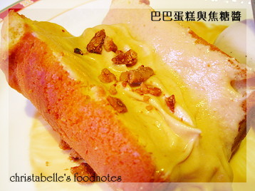 另外就是那有著可愛名字的「拿波里巴巴 Baba」蛋糕。巴巴蛋糕又叫 Baba au rhum,是一種加了酵母,還有浸了蘭姆酒(rhum)的葡萄乾,最後還要將整個蛋糕浸在蘭姆酒糖漿中裡才算成品。而之所以叫巴巴蛋糕,是因為發明這種蛋糕的波蘭國王是以阿里巴巴來命名的,挺有趣的!巴巴蛋糕因為有著極為鬆軟的質地,吸收液體的特性很強。季節師傅這裡加的是焦糖奶醬。巴巴蛋糕吃起來果真非常鬆,但單吃時其實感覺沒有很濕潤。這焦糖奶醬的味道很像義美牛奶糖喔!含在口中,彷彿回到小時候吃牛奶糖的單純幸福了。