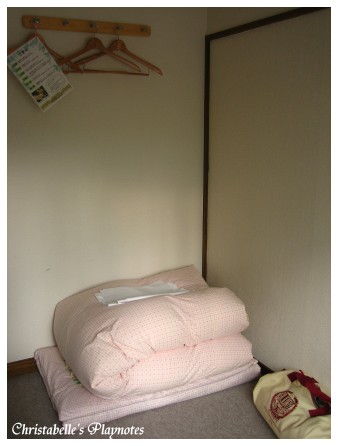 老闆娘帶我四處看看,並且上了二樓的五號房。房間不大,頂多睡四個人就差不多了,除了一張和室桌之外,牆上還有掛衣服的衣架,就沒有其他家具。地上鋪著地毯,還有一組墊被、棉被、枕頭。老闆娘給我乾淨並整燙過的棉被及枕頭套,告訴我六點半左右可以吃晚餐。