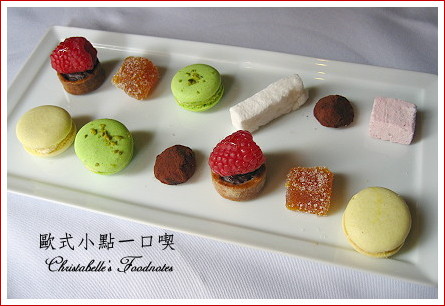 純白的方形法國Bernardaud瓷盤,排排站了六種迷你小點,兩人份共12個。這回季節師傅並沒有準備menu,改由老闆娘口說解釋。這六種一口喫小點包括「芒果軟糖」、「袖珍開心果杏仁圓餅 (macaron)」、「袖珍白桃杏仁圓餅」、「荔枝棉花糖」、「草莓胡椒棉花糖」、「覆盆子巧克力塔」、「圭內亞 (Guanaja) 苦味巧克力」等。老闆娘建議我們從芒果軟糖開始吃,最後以圭內亞苦味巧克力結束。