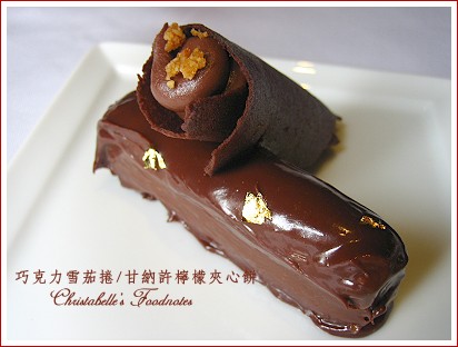 喝口咖啡,接著老闆娘送上第二道「單品式甜點」。今天季節師傅為我們準備了以巧克力為主角的兩種搭配--「巧克力雪茄捲」與「甘納許檸檬夾心」。這名稱當然是我自己隨意取的。雪茄捲果然長的就像一根雪茄,根據老闆娘不清不楚的介紹, 裡頭捲的是甘納許巧克力膏。所謂甘納許(ganache),是用半甜巧克力與鮮奶油一起用小火慢煮製巧克力完全溶化的狀態。季節師傅的雪茄捲,外頭捲餅吃起來是軟的,沒有太特出的巧克力味,但裡頭的甘納許,仔細品嚐可以嚐到些微的酒味。