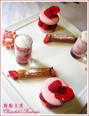 接著就算是今天的主菜了。很巧合的,這回與五月份來吃到的組合相當雷同,即素有「糕餅界的畢卡索」之稱的巴黎胖子甜點師傅Pierre Herme拿手絕配:「荔枝、覆盆子、玫瑰」。季節師傅這回為我們一人準備四樣甜點,包括「荔枝奶油球覆盆子夾心」、「荔枝覆盆子玫瑰雪酪」、「巧克力捲心餅」與「Emotion Ispahan」。
