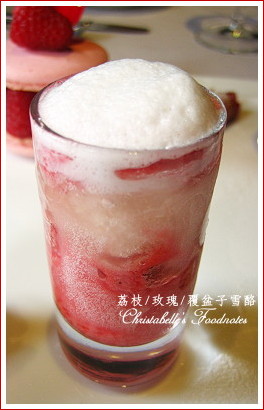 接著是三種組合的雪酪,同樣有著充滿幸福感的粉紅色,如同潑墨山水一般地在杯中流盪著,最頂上則是一層細膩的奶泡。我偏愛其中的上層,由玫瑰與荔枝交融而成,冰粒較粗,類似打的細一點的冰沙。而下層的覆盆子雪酪,質地就比較細緻,但口味也比較重一點。