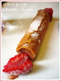接著是另一種不同的嘗試了。巧克力捲心餅,同樣回到以巧克力當主角,不過這次外頭捲的是酥脆的杏仁餅,兩端則故作可愛地以兩顆覆盆子裝飾著,表面還灑上白色細糖粉。外頭那捲餅皮與第二道前菜的 "三層夾心巧克力塔" 最底下的那層吃起來味道很像,所以我私自猜測同為杏仁餅。裡面的巧克力夾心沒有上一道那樣濃郁了,鮮奶油可能放的比較多一點。