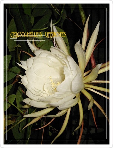 沒看過曇花開花的朋友,可能無法想像所謂曇花一現給人的驚喜與震撼。曇花的花苞最開始是從葉緣發出的,頂多一個指節那樣小,但盛開的曇花居然可以大到一個碗公那樣!層疊的花瓣有著柔白且如羽絨般的觸感,最外面還有另外一種細長如突觸般的花瓣,予人的視覺震撼久久無法退去。