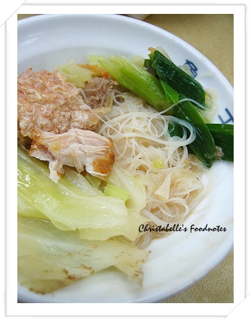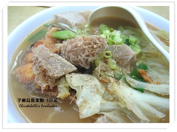 一位朋友看我吃的津津有味,不由得也吞了口口水,好在芋頭烏魚米粉也上桌來了。一樣是一大碗公,看起來非常豐富,果然有120塊錢的價值。他們倆便開始撈取了自己想吃的,只見一塊塊的芋頭、魚肉被挖了起來,還有高麗菜蔥花芹菜等等的。當然米粉也不會少。