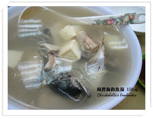 最後上桌的是現撈魚湯,看起來清爽至極。除了大卸數塊的整條魚,其餘就是豆腐與薑絲。我們問了老闆這是什麼魚,他顧著忙其他生意只呼嚨我們說就是海撈魚。真是令人無言。