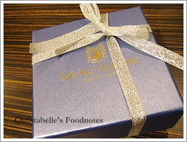既然標榜「甜點禮物」,包裝千萬不能馬虎!一位彬彬有禮的服務先生戴著白手套輕輕地將一個個渾圓的酥鬆小圓餅放進鋪了咖啡棉紙的盒中,放進一張說明紙,最後貼上製造保存日期貼紙。這紙盒可是與珠寶首飾同等級的硬紙盒,有沈穩的紅藍兩色與金銀緞帶交互選擇搭配,外頭還有燙金字藍底提袋,的確是體面的禮物。
