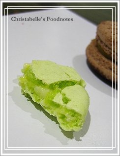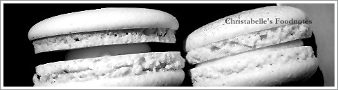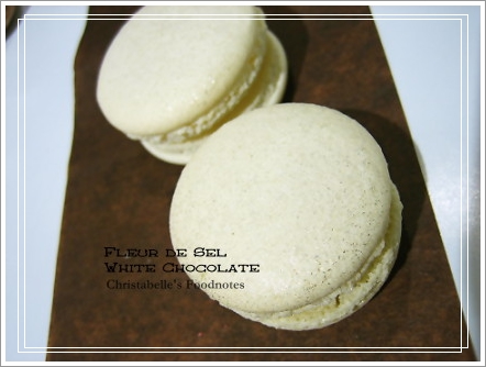 另外是「鹽花白巧克力」口味。這口味的小圓餅通體乳白,上面灑著上次法國PH白松露小圓餅如出一轍的金粉,在燈光下更顯貴氣。不過...看似圓滿的外表下,裡頭的白巧克力奶油餡似乎有些品管不良,一個滿溢於邊緣,一個卻像是賀喜巧克力形狀一樣地夾在兩片杏仁餅之間。同事將那個NG小圓餅拆開,裡頭的奶油餡有點硬梆梆的。我想私自猜測是因為巧克力本身容易因溫度而凝固,可能是製作的時候沒有注意到個關係。(請看最後一張照片)