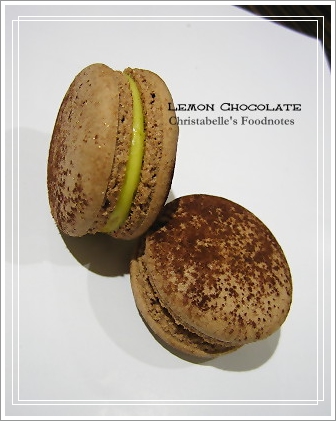最後一種是檸檬巧克力。外頭是巧克力口味的杏仁圓餅,灑上可可粉(我想是法芙納的可可粉吧?)還有金粉,與鹽花白巧克力算是一對了。裡面夾的是檸檬卡士達餡兒。