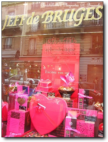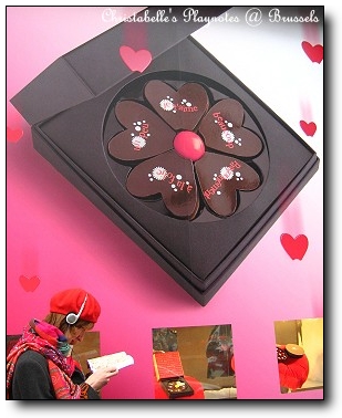 我在Brugge 的 neuhaus 曾經試吃過她們今年推出的情人節巧克力。她們今年以中國的「陰 Ying」與「陽Yang」為主題,白巧克力為「陰」,黑巧克力為「陽」,推出一款「陰陽調和」的巧克力禮盒。櫥窗海報上的的「♀ + ♂」為的就是符合這個概念。相形之下,隔壁的 Godiva似乎就顯的沒什麼創意了。XD