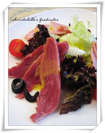 套餐附的沙拉冷盤算是有模有樣,給人漸入佳境的樂觀期待。大白瓷盤裡除了生菜之外,還有火腿與鴨胸肉片的組合。最後淋上澄汁。同事喝了湯半飽,因此由我代勞。個人覺得鴨胸的部分不是很理想。不夠鮮嫩,冷藏稍久因而嚼起來已然彈性疲乏。