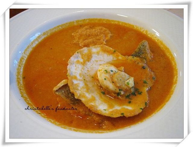 我的馬賽魚湯是以一大淺盤裝著的,有著開胃的鮮橘色。湯的質地一看就很濃稠,中央有兩塊鯛魚與一枚扇貝。