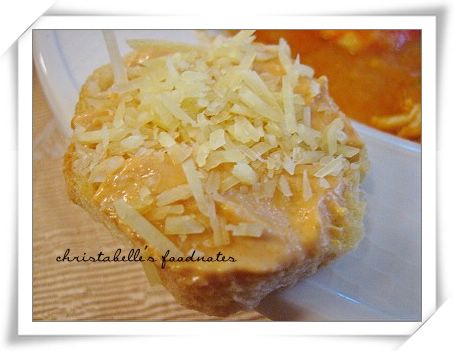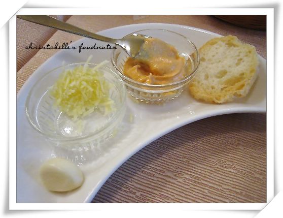 馬賽魚湯必須搭配的蒜味硬麵包(croutons ailles)與辣椒蛋黃醬(Rouille)也一併上桌。服務生教我將硬麵包與所附的大蒜搓磨之後,抹上辣椒蛋黃醬,灑上帕馬森起司,然後浸入魚湯之中一起享用。