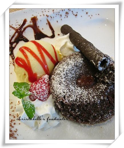 chocolate fondant 比 souffle 好。除了裝飾上較為繁複之外,口味上也蠻接近在法國吃到的。chocolate fondant部分,蛋糕體鬆厚,輕敲開巧克力醬順勢流洩出來,這景象實在動人。口味醇厚,相當不錯。至於香草冰淇淋,上面淋上草莓醬作為顏色及口味上的點綴,則是很盡責的扮演配角的部分了。請不用期待吃到滿滿的香草籽。