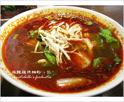 麻辣雞絲細粉上桌可把我嚇到了,湯頭活脫脫是麻辣火鍋的態勢。我小心翼翼地啜了口熱湯,一陣花椒香辣直沖鼻口,大呼過癮!而這辣度我是可以忍受的(別忘了,我老爸是湖南人)。雞絲只能說是陪襯性質,細粉份量不少,吸飽了麻辣湯汁,因此每一口都齒頰留香。