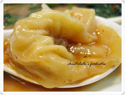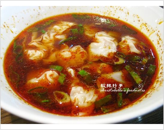 招牌的紅油抄手,一碗裡有十顆白嫩的抄手,灑上青白蔥花,小小一碗看似樸實無華,不過據說這紅油得耗上老闆四、五個小時的手工。吃起來麻中有辣卻又不嗆,抄手皮薄卻有彈性,豬肉餡子細緻沒有肉腥味兒。