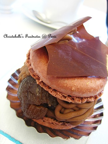 同事點的巧克力栗子macaron,以大型的巧克力macaron夾著一顆 marron glacier 與巧克力栗子醬,上頭還鋪著兩薄片苦甜巧克力。這道看似濃郁的甜點果然不孚期望,口味與預期中一樣有點重。由於整個栗子風味會被巧克力蓋掉,整體來說太甜,吃到最後竟然會膩口,只得多喝點茶了。