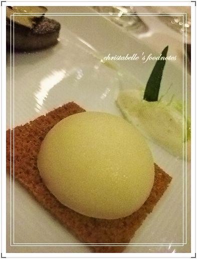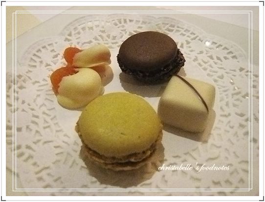 Petits Fours是搭配餐後茶或咖啡的小點心。其中最誘人的莫過於受前人不知凡幾稱讚的macaron。同事跟我的這盤裡有苦味巧克力及開心果口味。外型精巧,以指剝開時,用力過與不及都不行,稍微一不小心macaron就碎裂了。我倆分著吃,口中舌上滿盈著濃郁的杏仁糊香氣。果然是國內macaron的翹楚。