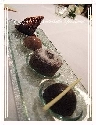 我的甜點是巧克力總匯,自左至右依序為溫熱巧克力漿、百里香巧克力冰淇淋、巧克力熔岩蛋糕,以及苦味巧克力膏。