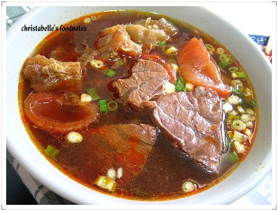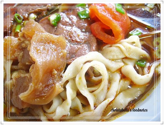 這家的蕃茄牛肉湯底看起來清爽不油膩,看的到大把蔥花及蕃茄果肉。牛肉節理分明,牛筋也頗具彈性。