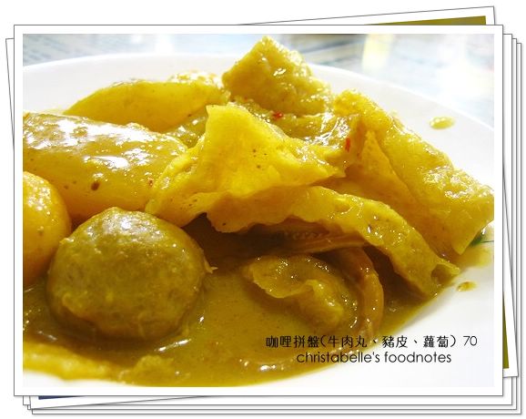 我也曾在鑫華茶餐廳吃過咖哩拼盤,不是很喜歡,甚至覺得有些不值得。不過香港茶水攤的就好很多,可能是咖哩的調味比較合我的口味,微辣,而且充滿濃濃的南洋風韻。咖哩盤裡有牛肉丸、白蘿蔔與豬皮。